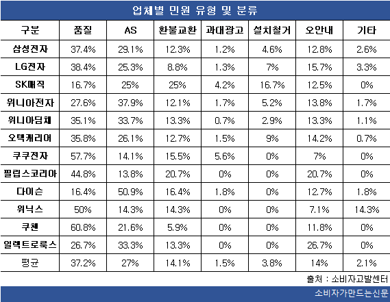 이밖에 ▶제품 설치철거 시 제품이나 가구·도배·장판 등이 손상됐다는 설치철거 민원 3.8% ▶제품 성능을 실제보다 뛰어난 것처럼 광고하는 과대광고 민원이 1.5%를 차지했다.