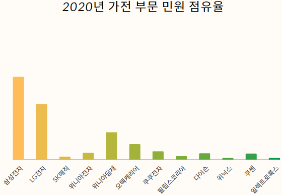 2020년 매출 상위 12개 가전업체를 대상으로 소비자고발센터(www.goso.co.kr)에 접수된 민원을 분석한 결과 업계 1, 2위인 삼성전자, LG전자의 민원이 각각 30%를 웃돌았다. 민원 점유율에 비해 삼성전자(48조1700억 원)와 LG전자(35조4489억 원)매출 규모가 차지하는 비중이 훨씬 더 커 민원관리는 우수한 것으로 볼 수 있다.