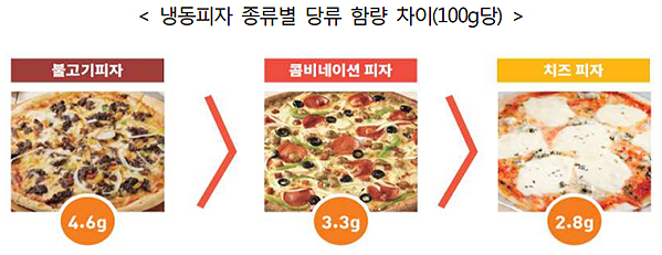 제품별 당류 함량은 최소 7.4g(리스트란테 모짜렐라 피자)에서 최대 28.7g(풀무원 노엣지 꽉찬토핑 피자 직화불고기)으로 1일 기준치의 최소 7.4% 내지 최대 28.7%에 해당했다.