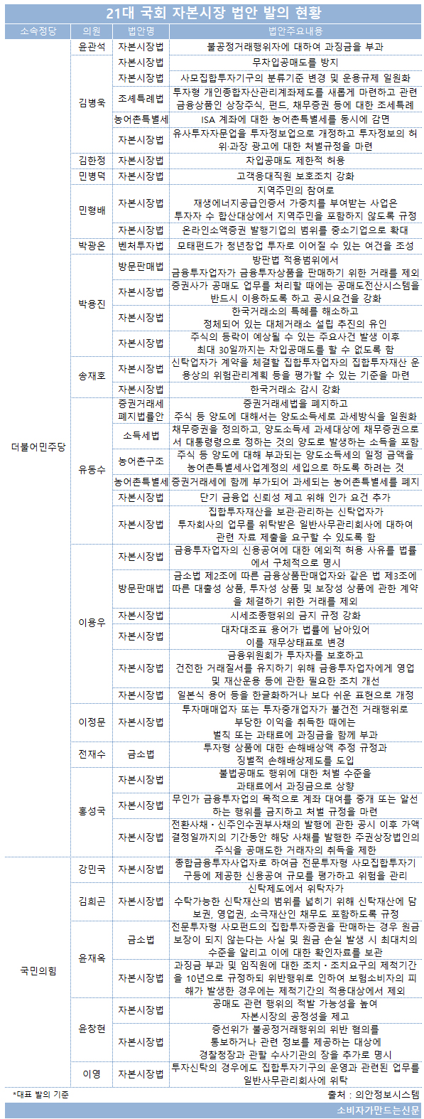 21대 국회가 개원한지 1년이 지나면서 다양한 금융관련 법안이 쏟아져나온 가운데 자본시장법에서는 ‘공매도 재개’와 사모펀드에 대한 후속조치로 ‘투자자 보호’ 관련 법안이 주를 이뤘다.