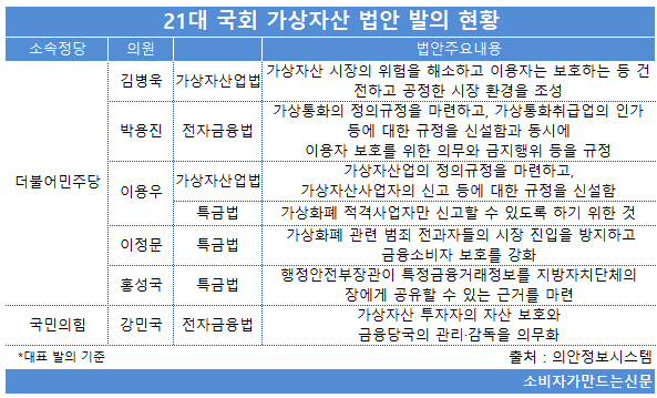 가상화폐 관련 사기가 횡행하는 등 사회적 이슈로 떠오르자 가상자산 투자자 보호를 위한 법안도 대거 발의됐다.