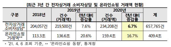 특히 전자상거래 소비자상담은 2020년에 6.7% 증가했지만 온라인 거래에서 많은 비중을 차지하고 있는 플랫폼 사업자 관련 소비자상담은 같은 기간에 57.2% 증가했다.