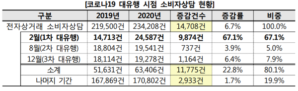 2019년 2월 대비 2020년 2월 증가 건(9874건)은 2020년 전자상거래 소비자상담 증가 건의 67.1%를 차지했다.