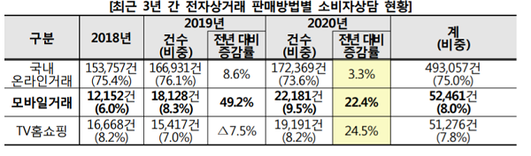 최근 3년 간 판매방법별로는 국내온라인거래 관련 상담이 75.0%로 가장 많은 비중을 차지했으며 모바일거래 8.0%, TV홈쇼핑 7.8% 순으로 접수됐다. 특히 모바일거래 소비자상담은 거래액의 증가와 함께 지속적으로 늘어나는 모습을 보였다.