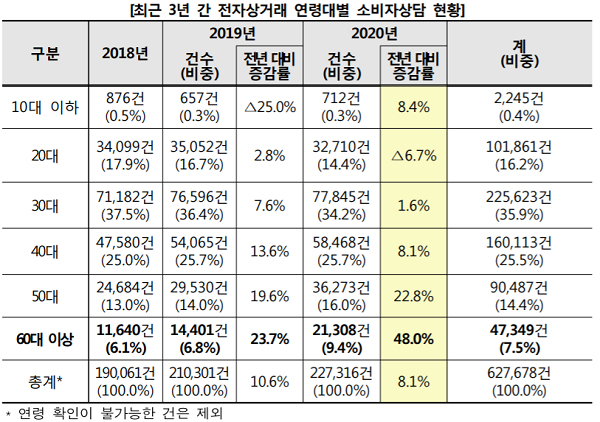 특히 2019년 대비 2020년 60대 이상 고령소비자의 전자상거래 상담 증감률은 48.0%로 전 연령대에서 가장 높게 나타났다.