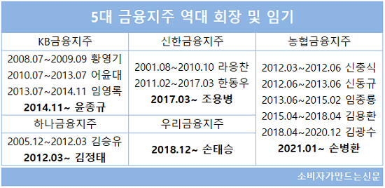 현재 주요 금융그룹은 회장을 포함한 임원의 임기를 2~3년으로 제한하고 있지만 연임 횟수의 제한은 두고 있지 않아 금융지주 회장들의 장기집권이 가능한 구조다.