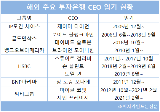해외 금융그룹으로 범위를 넓혀보면 JP모건체이스 제이미 다이먼 회장은 2005년 12월부터 CEO로 재임 중이고 뱅크오브아메리카(BOA) 브라이언 모이니한 회장은 2010년 1월, BNP파리바 장 로랑 보나페 회장도 2011년 12월부터 10년 넘게 최고 경영자 역할을 수행하고 있다.