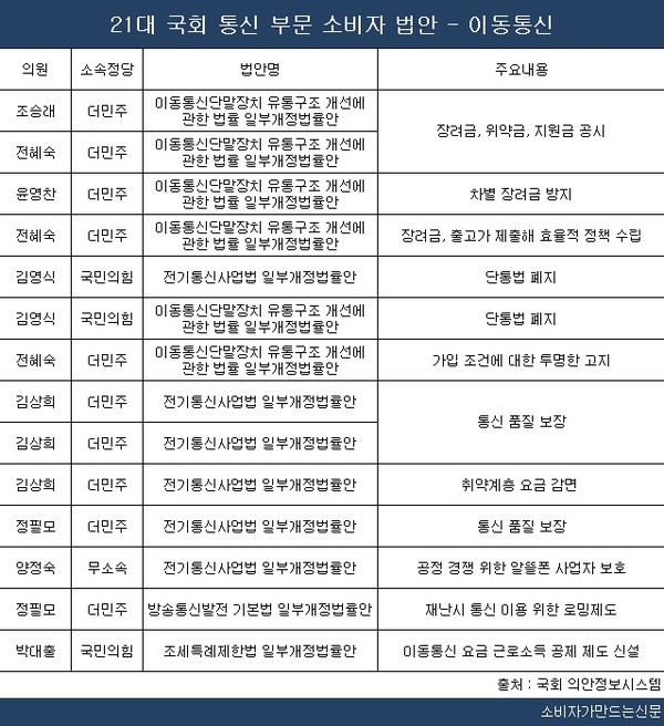 정필모 의원은 과학기술정보통신부장관이 전기통신역무에 관한 요금 및 품질 민원의 처리결과를 사업자별로 분석해 공개하고 전기통신사업자가 민원 처리결과를 정기적으로 공개해 이용자의 선택권을 보장하는 개정 법률안을, 양정숙 의원은 통신3사의 알뜰폰 계열사가 일정 비율을 초과해 알뜰폰 서비스를 제공할 수 없도록 해 알뜰폰 사업자를 보호하는 개정안을 발의했다.