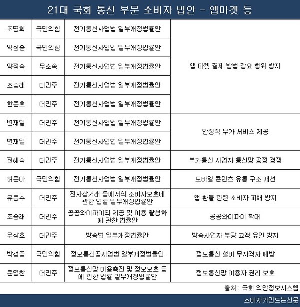조명희, 박성중, 양정숙, 조승래, 한준호 의원이 각각 발의한 ‘전기통신사업법 일부개정법률안’ 관련 5건의 법률안은 모두 '특정 결제 수단을 강요하는 앱 마켓 사업자'들의 독점적 지위를 제한해 공정한 경쟁을 도모하고 소비자 피해를 줄이는 내용을 골자로 한다.