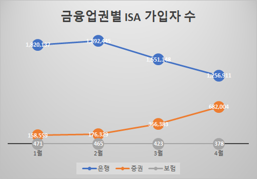 금융투자협회에 따르면 지난 4월 말 기준 증권사 전체 ISA계좌 가입 고객은 68만2004명으로 1월 15만8559명에 비해 4배(330.1%) 넘게 증가했다.