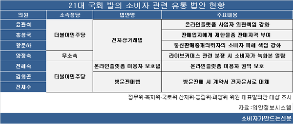 소비자가만드는신문이 21대 국회의원(사임위원 포함)들이 발의한 법안을 전수 조사한 결과 유통 소비자 보호와 관련된 법안은 7건으로 나타났다.