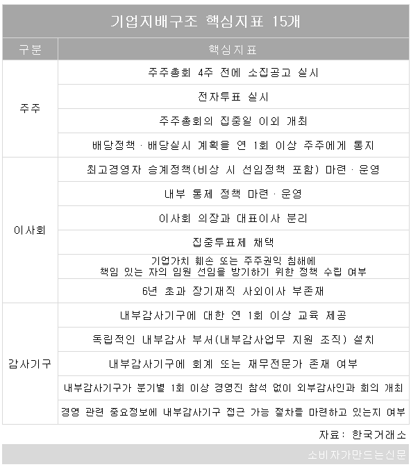 엔씨소프트는 감사기구 지표인 '경영진 참석 없이 감사위원회와 외부감사인간 분기별 1회 이상 회의 개최' 항목을, 카카오는 주주 지표인 '주주총회 4주 전 소집공고 시행'과 이사회 지표인 '명문화된 최고경영자 승계정책 마련·운영' 항목을 준수하며 핵심지표를 가장 잘 준수하는 기업이 됐다.