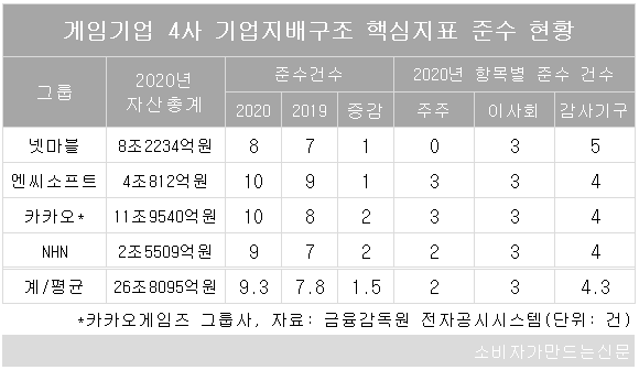 소비자가만드는신문이 기업 지배구조 보고서를 공시하고 있는 게임 관련 기업 4곳의 핵심지표 준수 현황을 살펴본 결과 주주와 이사회, 감사기구 세 부문을 통틀어 지난해 평균 9.3건을 준수한 것으로 집계됐다.