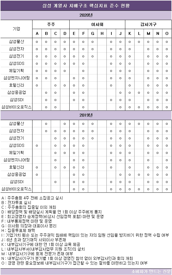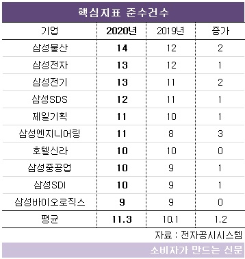 2019년에는 삼성그룹 10개 계열사 중 핵심지표 준수건수가 한 자릿수를 기록한 곳이 3곳이었으나, 지난해에는 삼성바이오로직스 1곳으로 줄었다.
