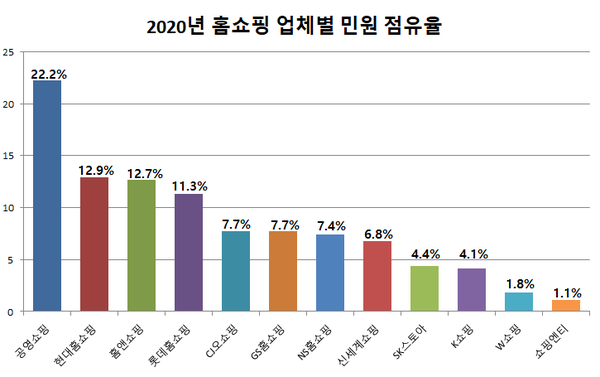 컨슈머리서치가 소비자고발센터(www.goso.co.kr)에 접수된 홈쇼핑사 12곳에 대한 민원을 분석한 결과 코로나19로 인한 마스크 대란 여파를 겪은 공영쇼핑이 22.2%의 민원을 점유했다. 이어 현대홈쇼핑과 홈앤쇼핑이 각각 12.9%, 12.7%를 기록하며 2, 3위를 기록했다.
