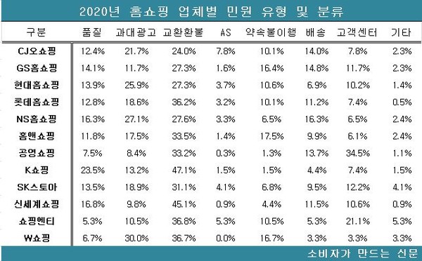 W쇼핑과 NS홈쇼핑은 과대광고 민원이 타 업체에 비해 높았다. CJ오쇼핑은 교환·환불 관련 민원과 과대광고 관련 민원 비율이 비슷하게 나타나 과대광고 문제 개선이 함께 요구됐다.