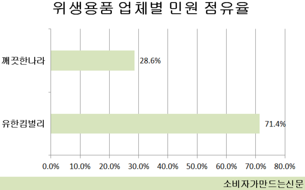 지난 한 해 동안 소비자고발센터(www.goso.co.kr)에 접수된 소비자 불만 중 위생용품부문에서 업계 선두를 다투는 유한킴벌리와 깨끗한나라를 살펴본 결과 유한킴벌리의 민원점유율이 71%, 깨끗한나라는 28%를 기록했다.