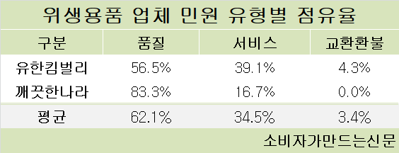 민원 유형별로 살펴보면 품질에 대한 소비자 불만이 62.1%로 가장 많았다. 유한킴벌리와 깨끗한나라 모두 품질에 50% 이상 민원이 집중됐다. 유한킴벌리는 직영몰이 활발히 운영되면서 품질 외에 서비스와 교환·환불 민원도 비교적 고르게 나타난 반면 깨끗한나라는 품질에 주로 민원이 집중됐다.