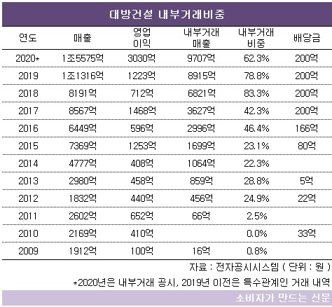 2011년 이후 대방건설 내부거래액은 단 한 번도 감소한 적 없다. 이 기간 매출은 1조3000억 원가량 증가했는데 내부거래액은 9500억 원 늘었다. 내부거래를 통해 회사 외형이 커진 셈이다.