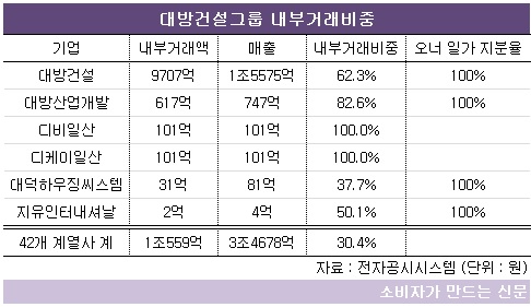 오너 일가가 지분을 보유한 계열사는 대방산업개발, 대방건설, 수전·도기 판매업체 지유인터내셔날, 경비용역·건물관리 업체 대덕하우징씨스템 등 4곳인데, 이들의 내부거래비중은 63.1%다.