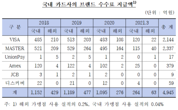 국회 정무위원회 소속 더불어민주당 김한정 의원실에 따르면 2018년 이래 국내 7개 전업 카드사가 외국계 6개 카드사에 지급한 브랜드 수수료는 총 4945억 원으로 마스터 2337억 원, 비자 2143억 원, 아멕스 379억 원, 디스커버 59억 원 순으로 집계됐다.