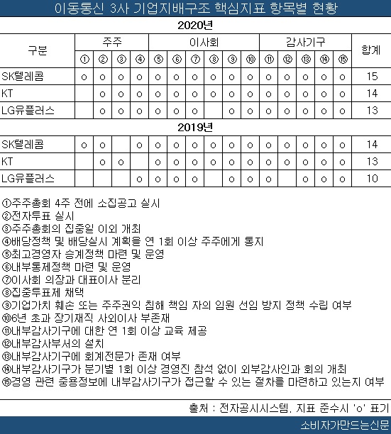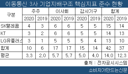 이동통신3사가 2020년 준수한 지배구조 핵심지표는 총 42개이며 2019년(37개)보다 5개, 평균 1.7개가 늘었다. 줄어든 곳은 한 곳도 없다.
