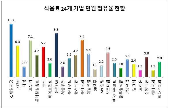 CJ제일제당은 유일하게 민원 점유율이 10%를 넘었지만 매출 대비해서는 선방한 것으로 평가됐다. 이어 3조 원을 웃도는 매출규모를 자랑하는 KT&G도 민원 점유율은 6%에 불과했다.