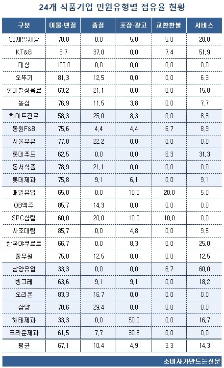 ◆ 이물질·변질 불만 70% 육박...고객센터 등 서비스 문제 개선 필요