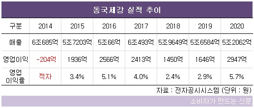 2017년 6조 원대를 기록한 이후 지난해까지 3년 연속 감소하던 매출도 올해는 반등할 전망이다. 키움증권은 6조1490억 원으로 동국제강이 2013년(6조6909억 원) 이후 8년 만에 가장 높은 많은 매출을 기록할 것으로 내다봤다.