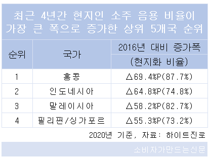 하이트진로에 따르면 최근 4년간 현지인의 소주 음용 비율이 가장 큰 폭으로 증가한 국가는 1위 홍콩, 2위 인도네시아로 4년간 60%포인트 이상씩 증가했다.