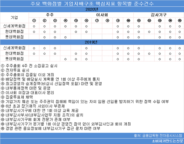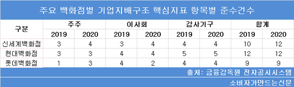 소비자가만드는신문이 기업 지배구조 보고서를 공시하고 있는 백화점 3사의 지배구조 핵심지표 준수 현황을 살펴본 결과 주주와 이사회, 감사기구 세 부문을 통틀어 지난해 평균 11건을 준수한 것으로 집계됐다.