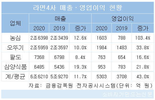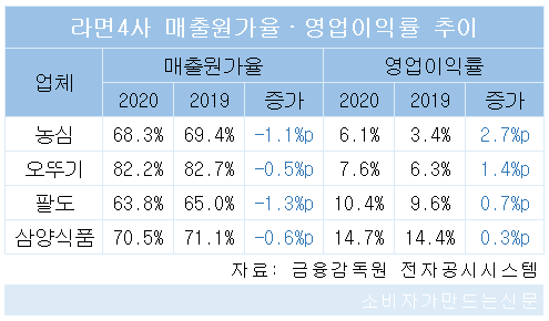 농심은 신라면, 너구리, 짜파게티, 육개장사발면 등 18개 라면제품 가격을 평균 5.5% 인상한 뒤로 4년 넘게 가격을 동결했다. 팔도와 삼양식품은 3~4년째, 오뚜기는 8년째 동결인데 올해 2월 오뚜기는 진라면 가격을 9% 인상하겠다고 했다가 5일 만에 자진 철회하기도 했다.