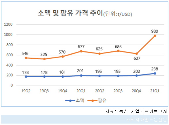 올 1분기 소맥과 팜유는 전분기보다 17.8%, 56.3% 증가했고 전년동기 대비로는 각 18.4%, 44.8% 늘었다. 지난 달 기준으로 평균 가격은 전년동기 대비 27%(소맥), 71%(팜유) 늘었다.