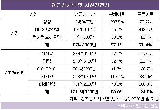 반면 비상장사인 성정이 지닌 현금성자산은 지난해 말 기준 2억8400만 원이다. 계열사인 대국건설산업(대표 형남순)과 백제컨트리클럽 현금을 모두 더해도 67억 원에 그친다.