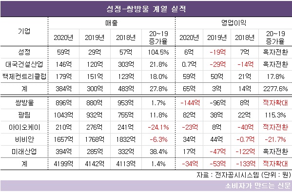 성정과 대국건설산업, 백제컨트리클럽의 지난해 영업이익은 총 65억 원이다. 2018년(14억 원)과 2019년(3억 원)에 비해 증가했다.