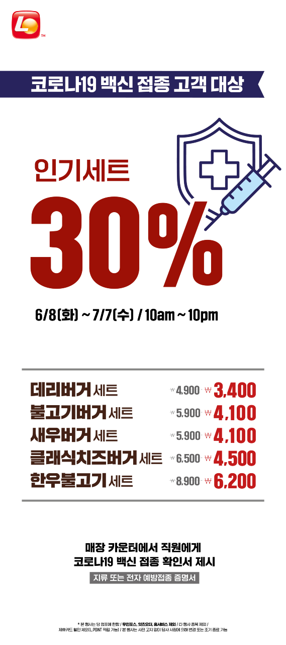 롯데리아는 다음 달 7일까지 전국 약 350개 직영점 및 가맹점에서 오전 10시부터 오후 10시까지 코로나19 예방 접종 증명서를 매장 카운터에 제시하는 고객을 대상으로 인기 메뉴 5종을 약 30% 할인 판매한다.