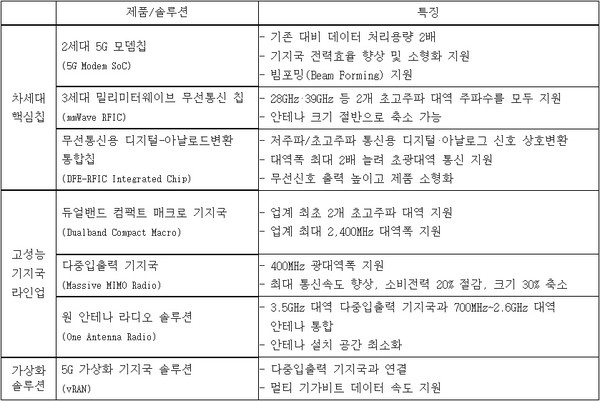 이날 공개된 기지국용 차세대 핵심칩은 ▲2세대 5G 모뎀칩 ▲3세대 밀리미터웨이브 무선통신 칩 ▲무선통신용 디지털-아날로그 변환 통합 칩 등 3종으로, 성능과 전력 효율을 높이면서도 기지국 크기를 줄일 수 있다는 게 공통된 특장점이다.
