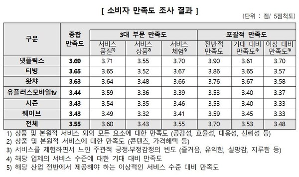조사결과 6개 OTT 서비스 종합만족도는 평균 3.55점이다. 사업자별로는 넷플릭스(3.69점), 티빙(3.65점), 왓챠(3.63점)가 상대적으로 높았고, 유플러스모바일tv(3.44점), 시즌(3.43점), 웨이브(3.43점)는 상대적으로 낮았다.