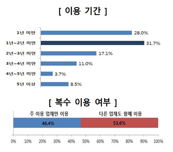 1800명을 대상으로 이용실태를 조사한 결과, 서비스를 이용한 기간으로는 ‘1년 이상 ~ 2년 미만’이 31.7%(571명)로 가장 많았고, ‘1년 미만’ 28.0%, ‘2년 이상 ~ 3년 미만’ 17.1% 순이었다.