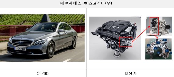 벤츠 C 200 2537대는 엔진제어장치(ECU) 소프트웨어 오류로 장시간 공회전 시 발전기 내 부품(다이오드)이 과열돼 화재가 발생할 가능성이 제기됐다.