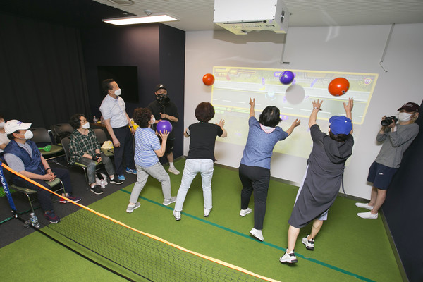 시니어 치매예방 활동에 지원된 리얼큐브는 현실 공간에 반응형 기술과 위치 및 동작 인식이 가능한 센서를 연동해 VR 기기(HMD)나 AR 글래스 없이도 가상환경을 체험할 수 있는 혼합현실(MR) 서비스다. 부가적인 장비 착용이 불편한 시니어들도 메타버스 환경에서 실감나는 체험이 가능하다.
