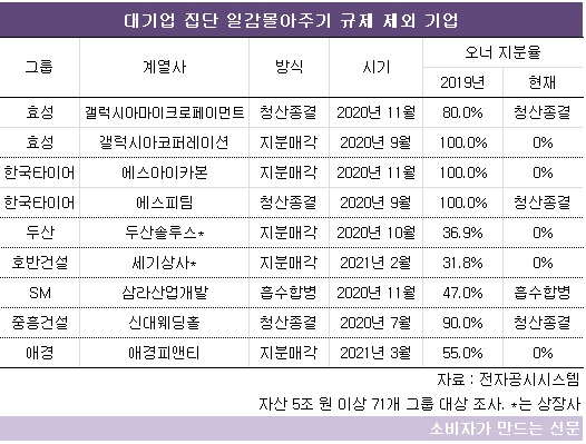 지난해부터 두산, 효성, 한국타이어, 호반건설, SM, 중흥건설, 애경 등 7개 그룹이 지분매각, 흡수합병, 청산 등의 방식으로 일감 몰아주기 규제 대상 계열사를 정리했다. 실익은 없고 논란소지가 있는 기업이 주요 정리 대상이다.