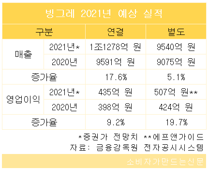 최근 증권가에서 발표한 실적 추정치에 따르면 빙그레의 올해 연결 기준 연매출은 지난해보다 약 18% 늘어난 1조1278억 원으로, 창사 이래 첫 1조 클럽 가입이 예상되고 있다. 연간 영업이익은 435억 원으로 9% 증가할 것으로 분석됐다.
