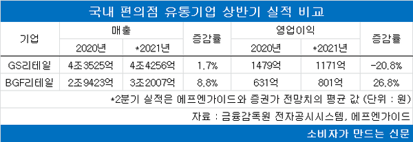 특히 편의점 업체 '빅2'인 GS리테일(대표 허연수)과 BGF리테일(대표 이건준)은 올 상반기 영업이익이 눈에 띄는 증가세를 기록할 것으로 보인다.