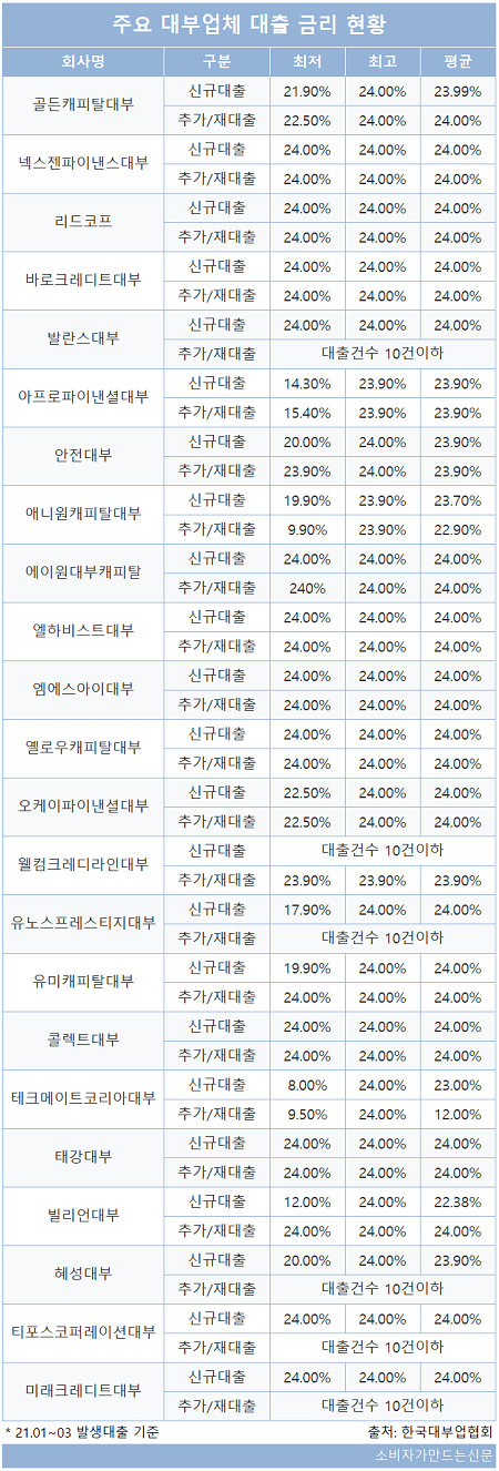 한국대부업협회에 따르면 올해 신규대출이 발생한 23개 대부업체 모두 최고 연 23.9~24.0% 금리를 부과하고 있다.