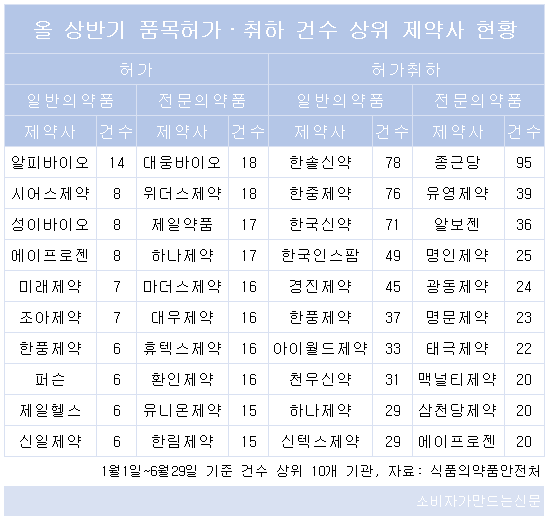 허가취하 건수는 일반의약품은 한솔신약이 78품목으로 가장 많았다. 이어 한중제약(대표 한재석) 76품목, 한국신약(대표 한상욱) 71품목 순이었다. 전문의약품은 종근당(95품목), 유영제약(대표 유우평, 39품목), 알보젠코리아(대표 이준수, 36품목) 순으로 건수가 많았다.