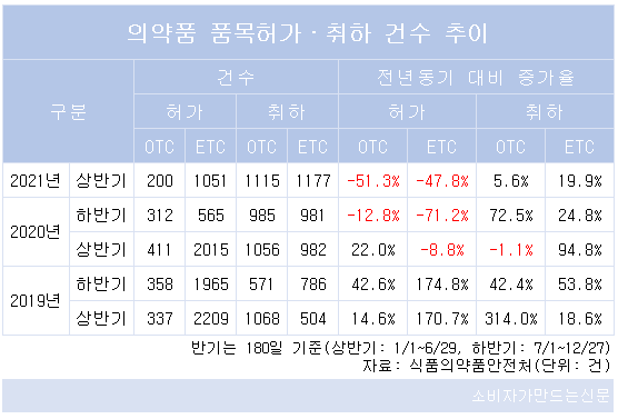 유형별로 보면 일반의약품(OTC) 승인건수는 지난해 상반기 대비 51% 감소했고 전문의약품(ETC)도 48% 감소했다. 품목취하는 일반의약품과 전문의약품 모두 5.6%, 19.9% 늘었다.