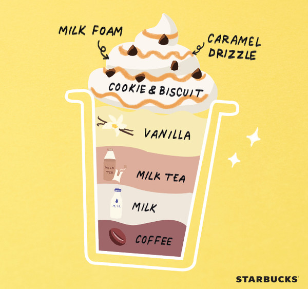 부드러운 커피와 밀크 티가 어우러지는 맛에 초콜릿 칩 쿠키를 씹는 재미를 더했다. 1단계 커피, 2단계 우유, 3단계 밀크 티, 4단계 바닐라, 5단계 밀크 폼, 6단계 쿠키 토핑, 7단계 카라멜 드리즐 등 고객이 직접 선택한 레시피로 개발된 최초의 음료라는 점에서 의미가 깊다는 게 회사 측 설명이다.