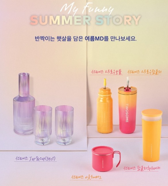 투썸플레이스에 따르면 이번 상품은 이국적인 트로피컬 컬러와 홀로그램 가공으로 여름 아침 해변에서 만나는 반짝이는 햇살을 표현했다. 실용도가 높은 스테인리스 스틸 소재의 텀블러와 보틀, 캠핑 등 야외활동에 유용한 머그, 트렌디한 홀로그램 기법을 접목한 유리 소재 물병과 컵 세트 등으로 출시한다.