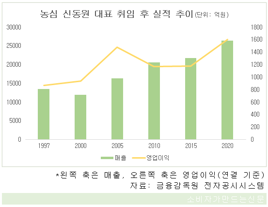 신동원 회장이 대표이사에 오른 이후의 농심 실적을 연결 기준으로 살펴보면, 1997년에는 매출과 영업이익이 전년에 비해 각 18.7% 121.3% 증가한 1조3590억 원과 869억 원을 기록했다.